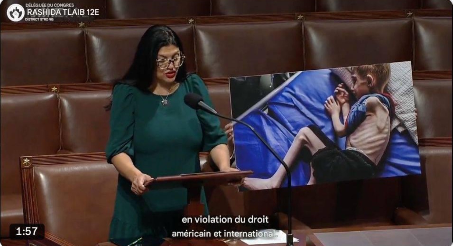Devant la Chambre des représentants, Rashida Tlaib détourne l'image d'un enfant atteint d'une maladie rare pour faire croire qu'Israël affame les enfants palestiniens.